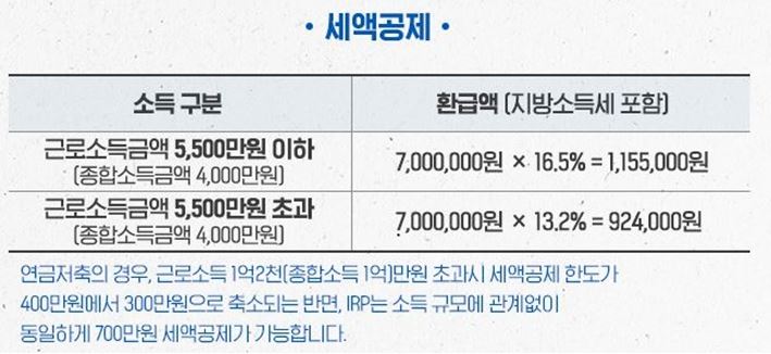 5,500만원보다 높으면 13.2%, 낮으면 16.5%의 세액공제를 받을 수 있는 것이지요. 연봉 5,500만원 이하의 근로자가 세액공제액의 최대한도인 400만원을 공제받는다고 했을때, 세액으로 돌려받을 수 있는 금액은 66만원이 됩니다.