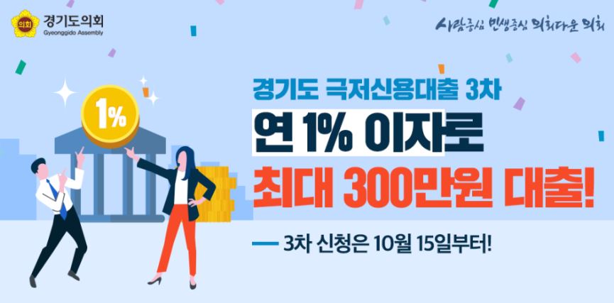 오는 10월15일 부터는 극저신용대출 3차 신청을 받는다는 소식입니다. 20%이상의 고금리 대출이나 불법사금융을 이용하지 않고 연1%의 초저금리로 대출을 받을 수 있기 때문에 자격조건이 되는 분들은 무조건 신청부터 하시길 바라며 이번글에서 경기도 극저신용대출 3차 자격조건 및 신청방법에 대해 자세히 알아보겠습니다.