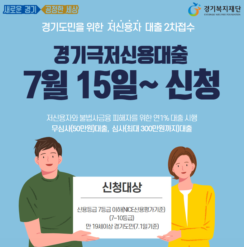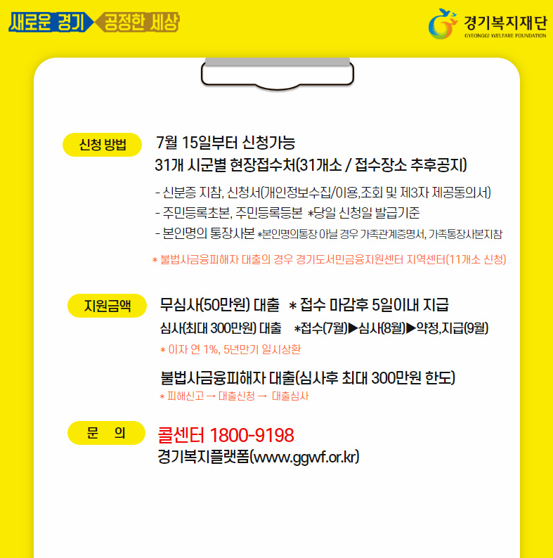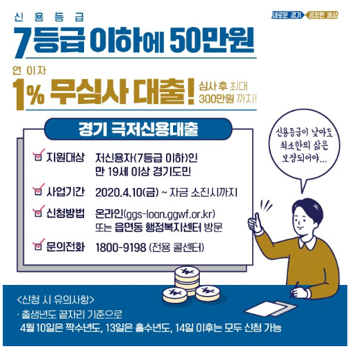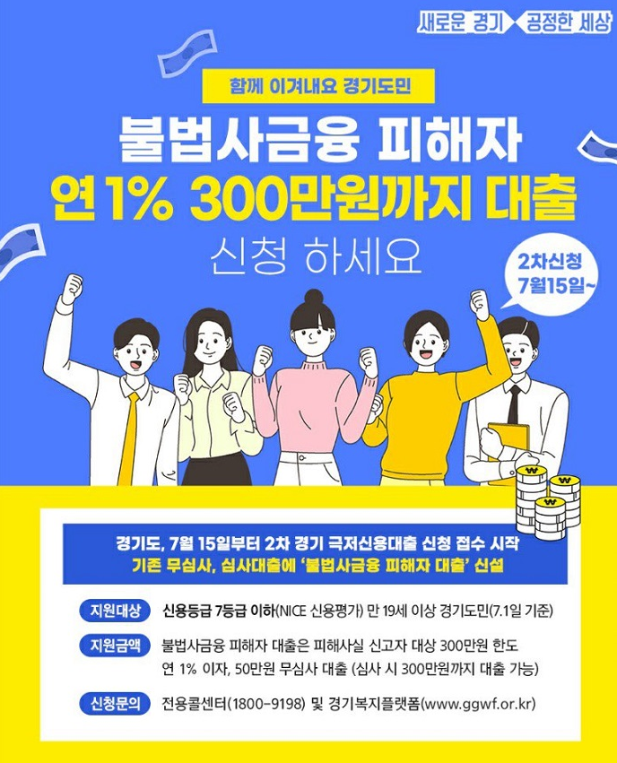 하지만 여전히 어려움을 겪는 분들이 많자, 경기도에서는 불법사금융 피해자 대출제도를 신설했는데요. 저신용자와 불법사금융 피해자 분들을 위한 극저신용 대출 2차 신청은 무엇인지 알아보겠습니다.