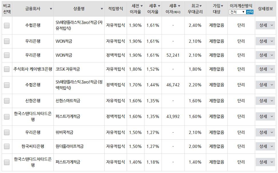 수협은행과 우리은행 WON적금 상품이 1.90%로 가장 높습니다. 2금융권인 저축은행 금리와는 대략 1.0%정도 차이가 나는 것을 확인할 수 있습니다. 한가지 팁을 드리자면, 수협은행은 상호금융으로 예적금 금리에 대해 세금우대까지 받을 수 있는데요.