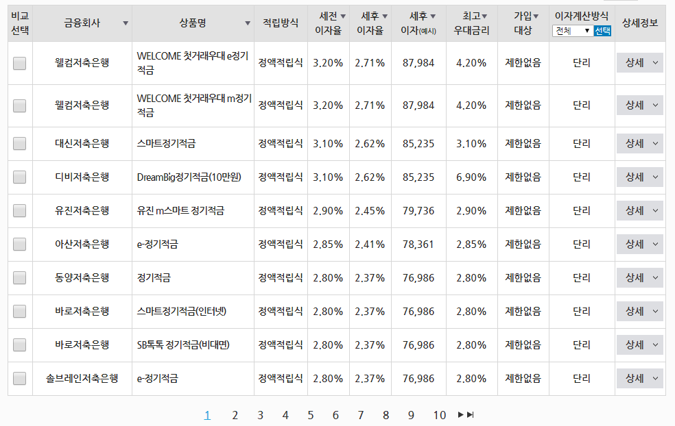 결과는 첫페이지를 장식하는 적금상품들은 모두 2금융권 저축은행 상품이 차지하고 있군요? 특히 웰컴저축은행은 세전 3.20%로 유일하게 3%대 금리를 제공하고 있습니다. 그렇다면 1금융권 은행만 한번 살펴볼까요?