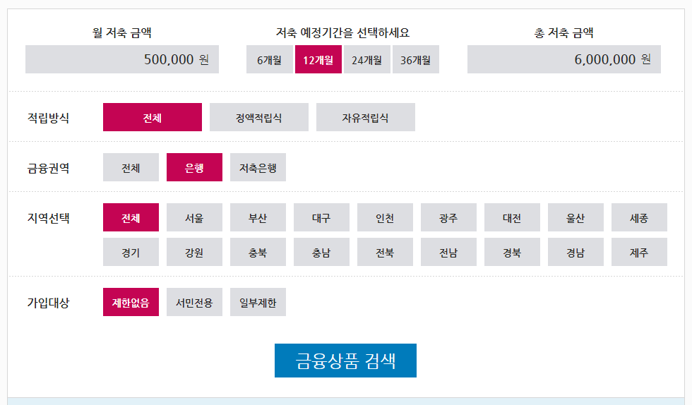정기예금 부터 한번 비교해 볼까요? 우선, 적립예정인 월 저축금액과 기간을 설정해줍니다. 저는 월 적금액을 50만원으로 설정해 봤는데요. 적립방식을 정하고 1금융권만 비교할지 2금융권을 포함할지 정한 후, 지역을 선택한 뒤 금융상품 검색을 눌러줍니다.