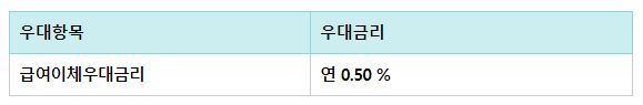 우대금리는 0.5%로 높은편이며 적용 받기 위한 조건도 까다롭지 않습니다.
