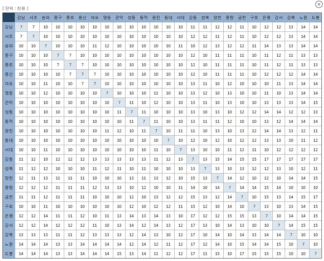 아래는 한업체의 오토바이 퀵 서비스 요금조회표입니다.