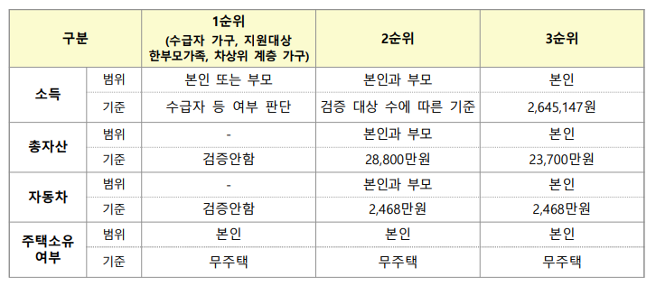 순위별 입주자 순위는 1~3순위로 구분되며 1순위에 해당하는 경우 총자산과 자동차에 대한 검증은 하지 않습니다. 단, 2순위부터는 신청자와 부모의 총자산과 자동차 합계에 따라 제한이 있습니다.