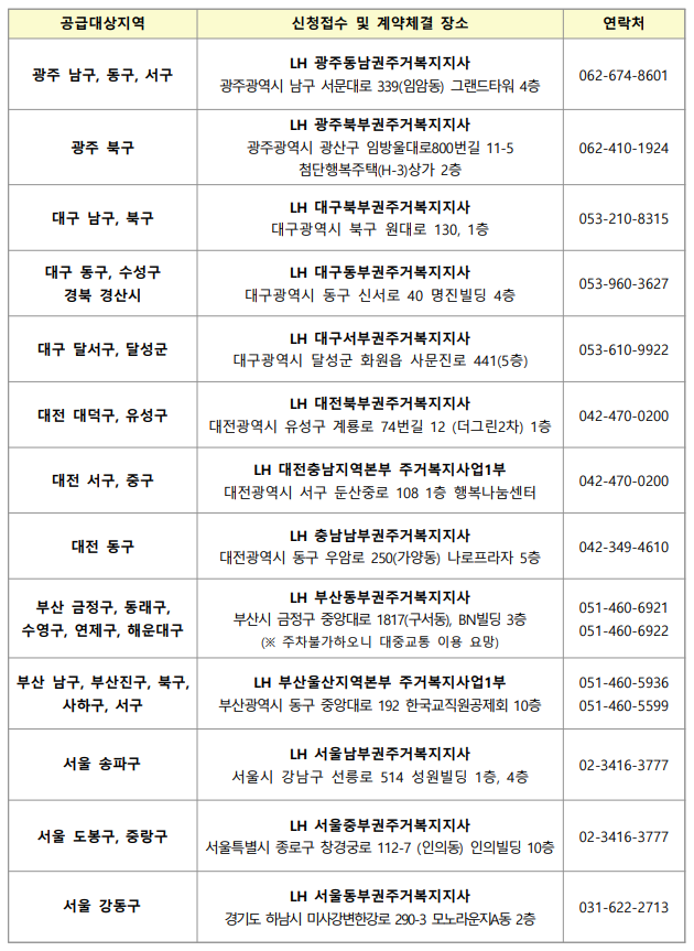 궁금한 점이나 문의사항이 있는 경우 LH청약센터 게시판 또는 마이홈 콜센터 (1600-1004)를 통해 문의할 수 있습니다. 아울러, 부산도시공사와 대전도시공사가 모집하는 청년 신혼부부 매입임대주택 호에 대한 내용은 부산도시공사 및 대전도시공사를 통해 확인 할 수 있습니다.