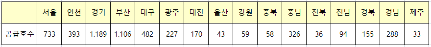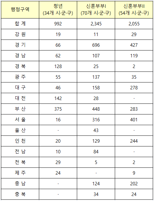행정구역별로는 경기도가 청년 66호, 신혼부부I 696호, 신혼부부II가 427호로 가장 많으며 다음으로는 서울시 (청년 16호, 신혼부부I 316호, 신혼부부II 401호)와 부산시 (청년 375호, 신혼부부I 448호, 신혼부부II 283호)가 뒤를 따르고 있습니다.