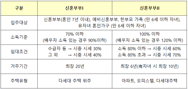 소득기준 70%이하로 시세의 30%-40%로 거주할 수 있는 신혼부부I 유형은 다세대 주택위주로 임대가능하며 최장 20년까지 거주할 수 있습니다.
